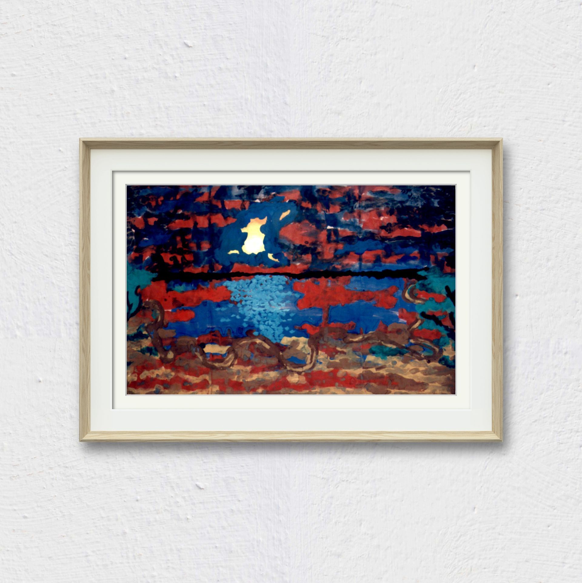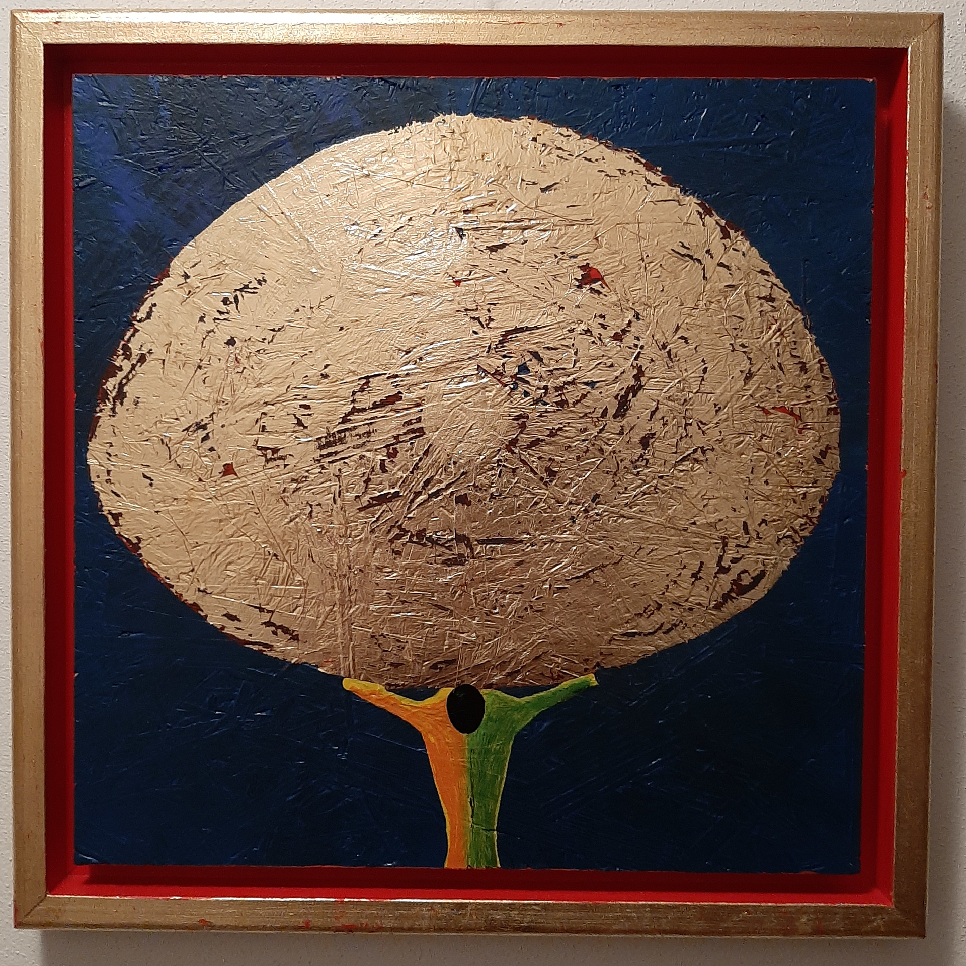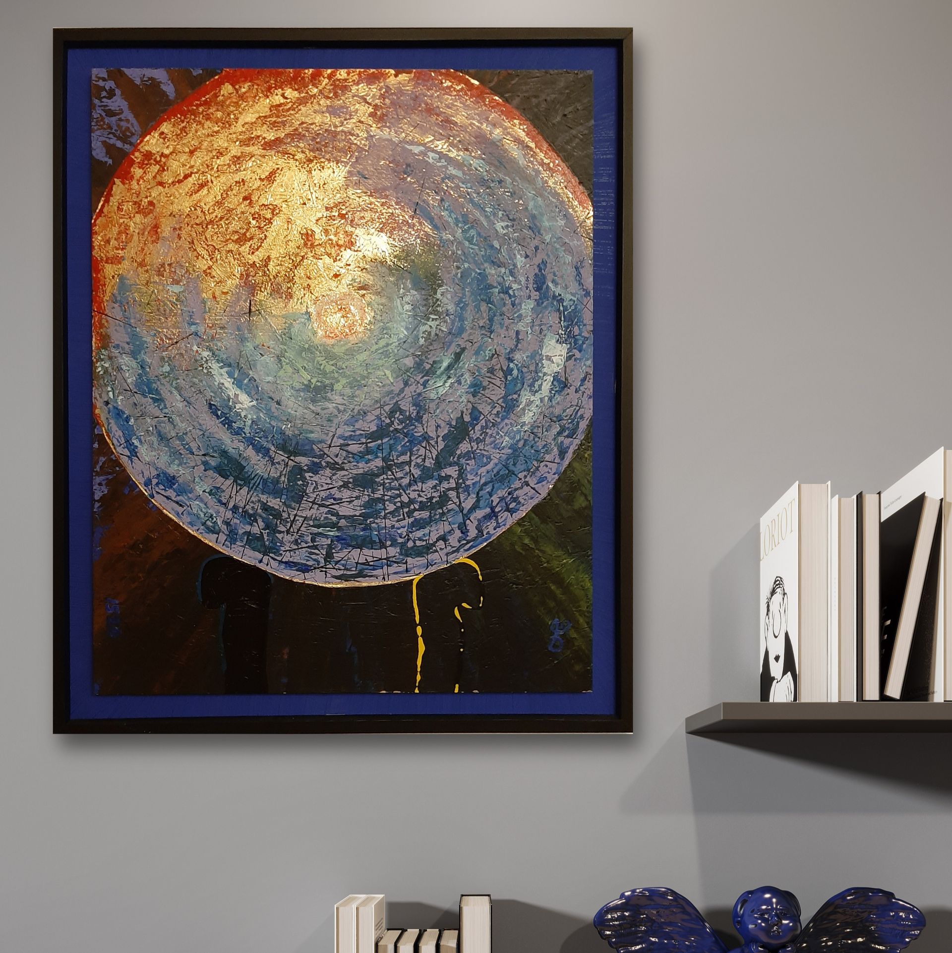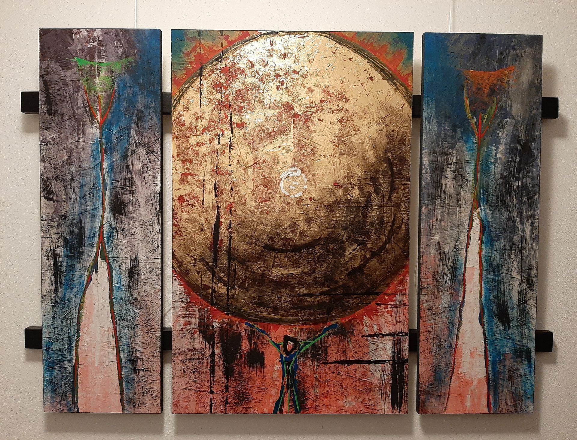 Ein Licht bricht durch die Finsternis – nicht sanft, sondern wie ein Strahlengewitter. Aus der Tiefe des Schwarz schießen goldene Bahnen, reißen den Blick mit sich, zwingen ihn in die Mitte. Das Auge wandert entlang zerklüfteter Linien aus Strukturpaste, durchschneidet Farbschichten, tastet über Lackflächen, bis das Blattgold zu glühen beginnt. Jede Schicht – Farbe, Material, Glanz – erzählt von Überlagerung, von Bewegung, von einer Sonne, die nicht wärmt, sondern aufrüttelt. Der Himmel wirkt wie zerrissen, das Land wie erstarrt – und doch liegt darin eine stille Kraft, ein Aufbruch aus Dunkelheit.